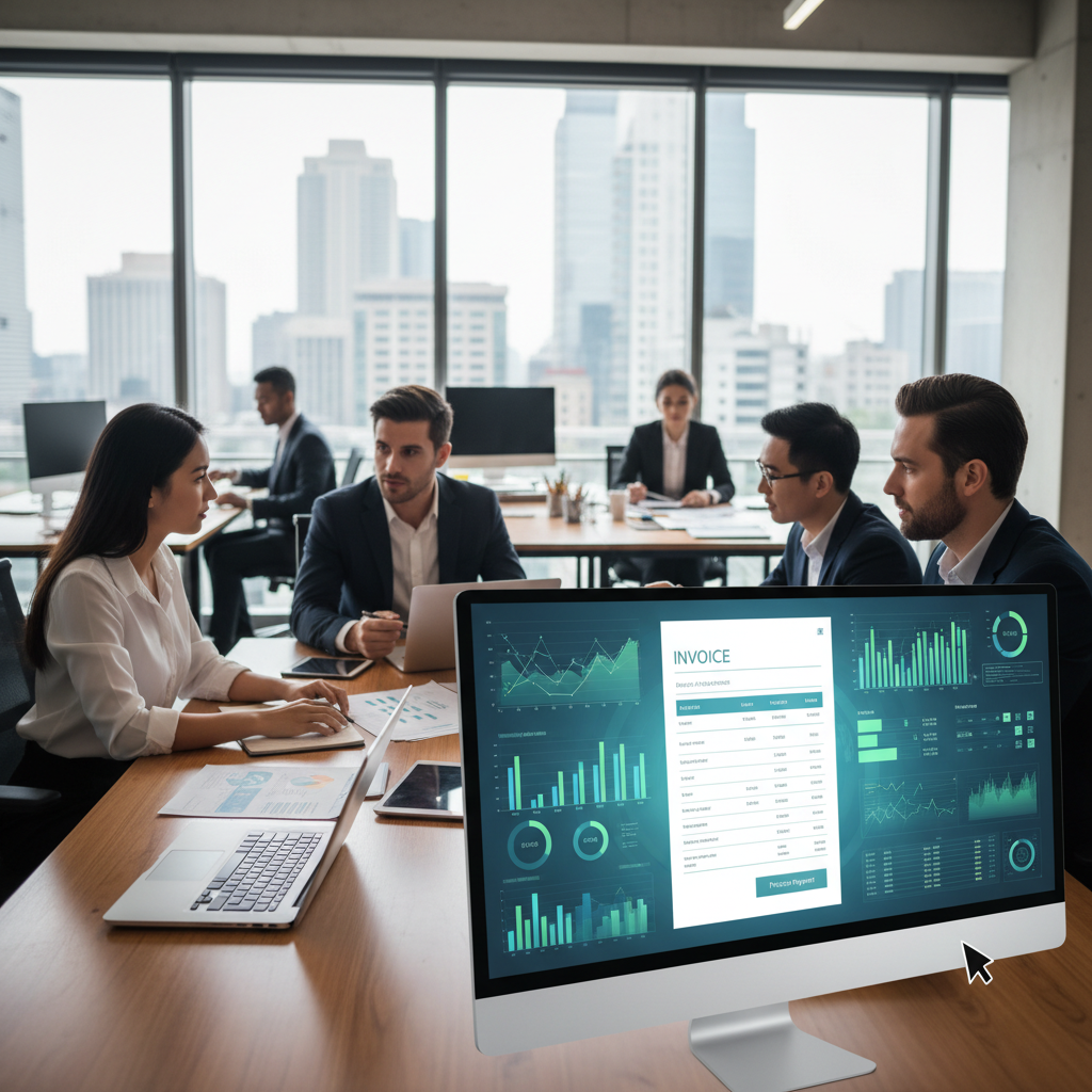 In a vibrant office space, teams engage in collaborative discussions around financial documents, utilizing various digital devices, demonstrating the power of automation in their daily workflow. The depicted environment highlights the shift from manual processes to streamlined digital solutions.