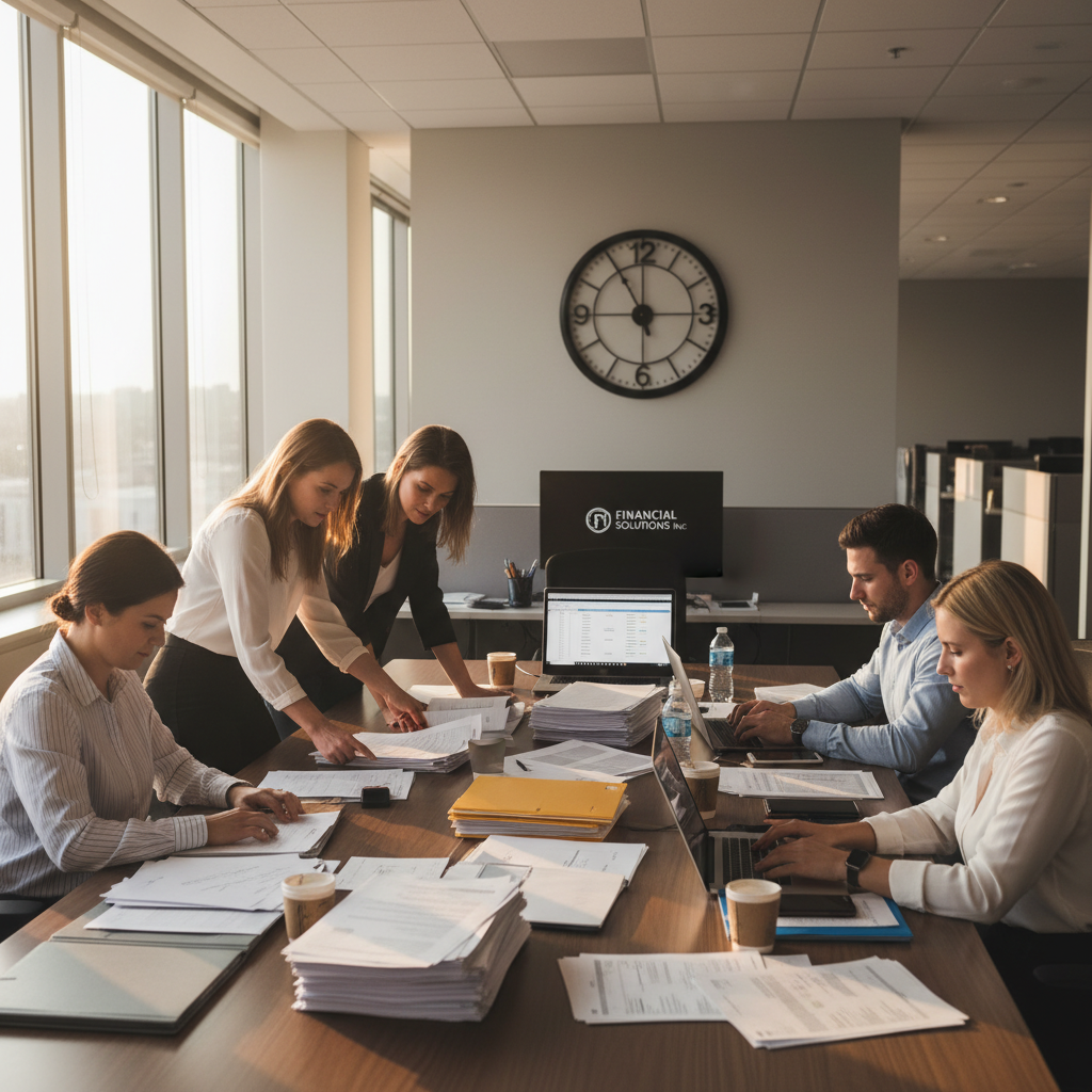 In the office, a busy finance team surrounds a large conference table cluttered with invoices and laptops. While some team members diligently review documents, others rush to input data, a clock on the wall indicating the late afternoon hour—evidence of their overtime efforts. The natural light streaming through the windows contrasts the chaos of paperwork, symbolizing the transformative potential that an automated invoicing process could deliver.